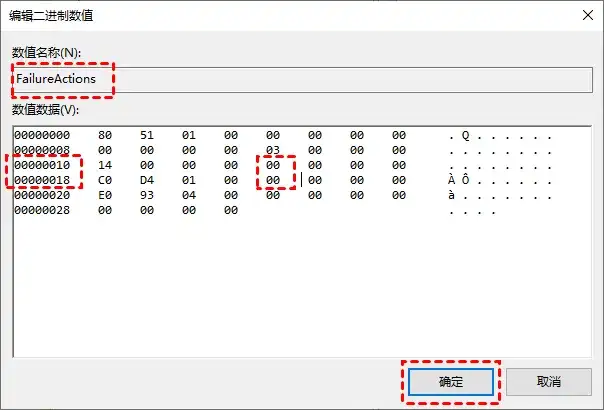 4. 然后再找到"FailureActions"键并双击进行编辑,将"00000010"和"00000018"行中的第五个数值,由原来的"01"改为"00",再单击"确定"。