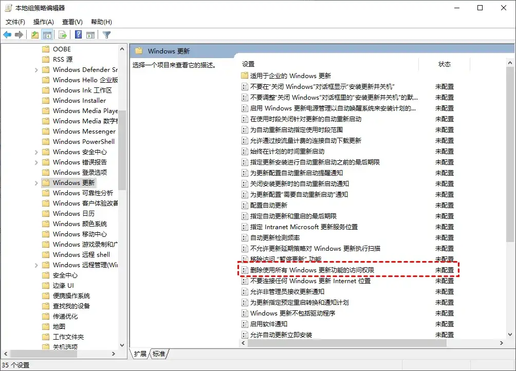 - 然后在"Windows更新"页面找到"删除使用所有Windows更新功能的访问权限",并双击打开它。