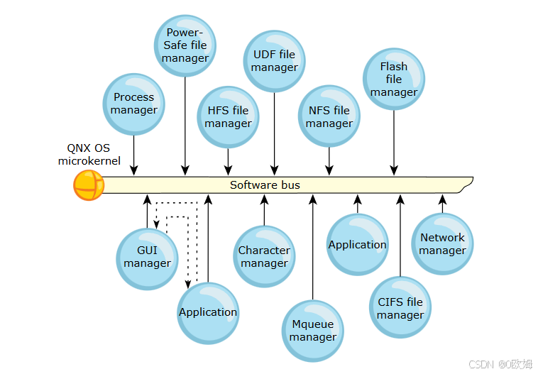 - QNX 微内核是一条"软件总线",相关资源管理器挂载到该总线上;