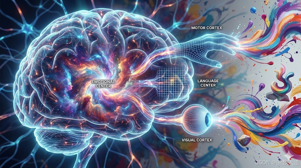 - 右脑与非语言表达: 右脑半球在处理情绪、面部识别、空间关系和整体模式方面扮演主导角色,这些功能与非语言沟通和艺术创作密切相关。艺术创作直接激活了大脑的多个非语言区域,包括视觉皮层(Visual Cortex)、体感皮层(Somatosensory Cortex)、运动皮层(Motor Cortex)以及与情绪调节和自我意识相关的前额叶皮层。