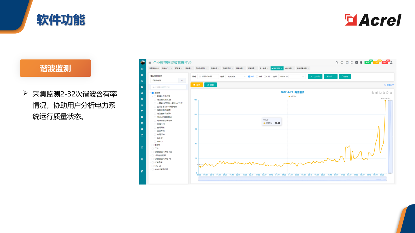 电能质量诊断:监测谐波、电压暂降等质量问题,评估其对敏感设备的影响,提供治理建议。