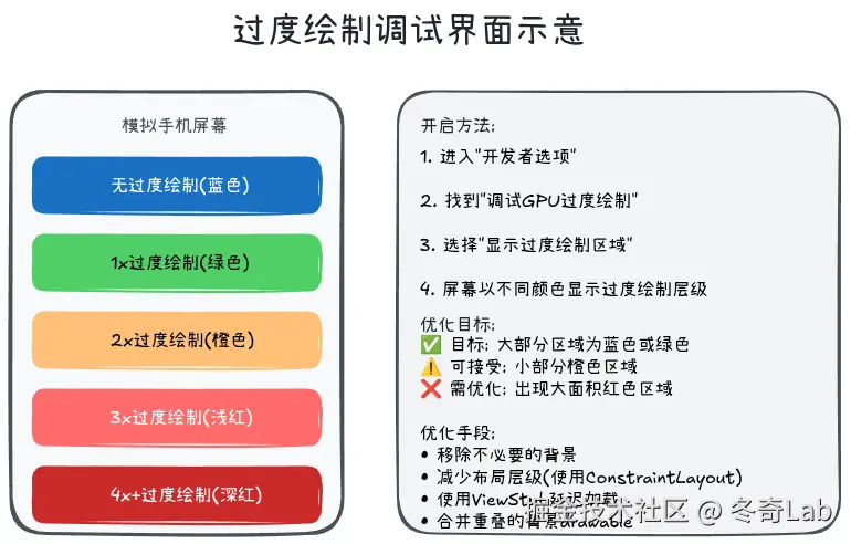 | 过度绘制 | 4x (红色) | 1x (蓝色) | -75% |