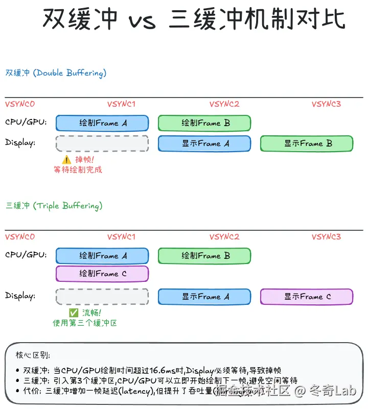 代价: 额外的内存占用 + 1帧延迟 (Latency)。