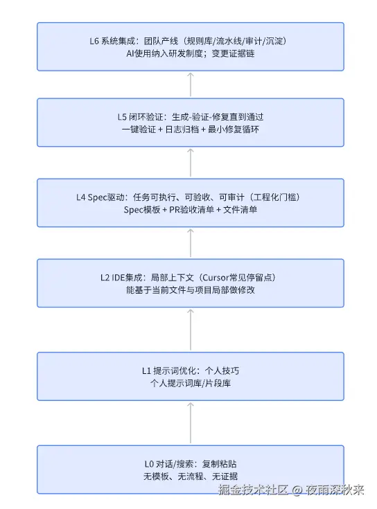 个人使用cursor开发获得的项目级经验很难变成团队资产,为了便于团队落地,把能力分级从"行为描述"升级为"组织资产模型"。