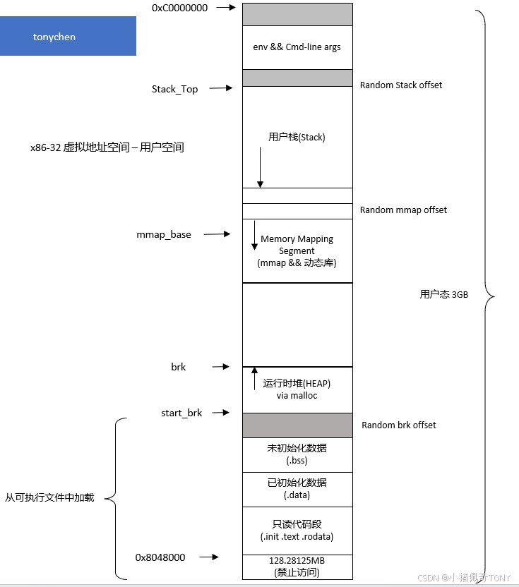 这样内核的代码段,全局变量,BSS 也就会被映射到 3G 后的虚拟地址空间里面。具体的物理内存布局可以查看