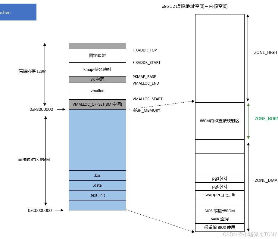 ZONE_HIGHMEM(896M~结束)是系统中剩下的可用内存,但因为内核的地址空间有限,这部分内存不直接映射到内核
