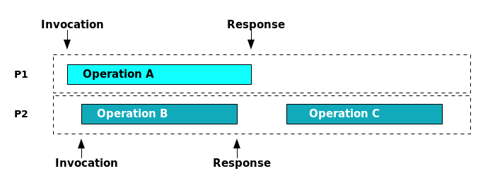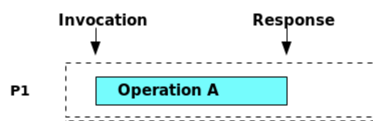 - 操作的可视化: 每个操作(如读或写)都有一个开始时间 (Invocation) 和一个结束时间 (Response)。我们将它表示为一个在时间轴上延伸的水平条。