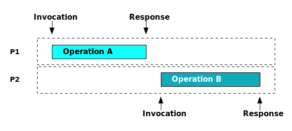 - 顺序操作 (Sequential Operations): 如果操作A的结束时间早于操作B的开始时间(如下图),我们就说 A 先于 (precedes) B,记为