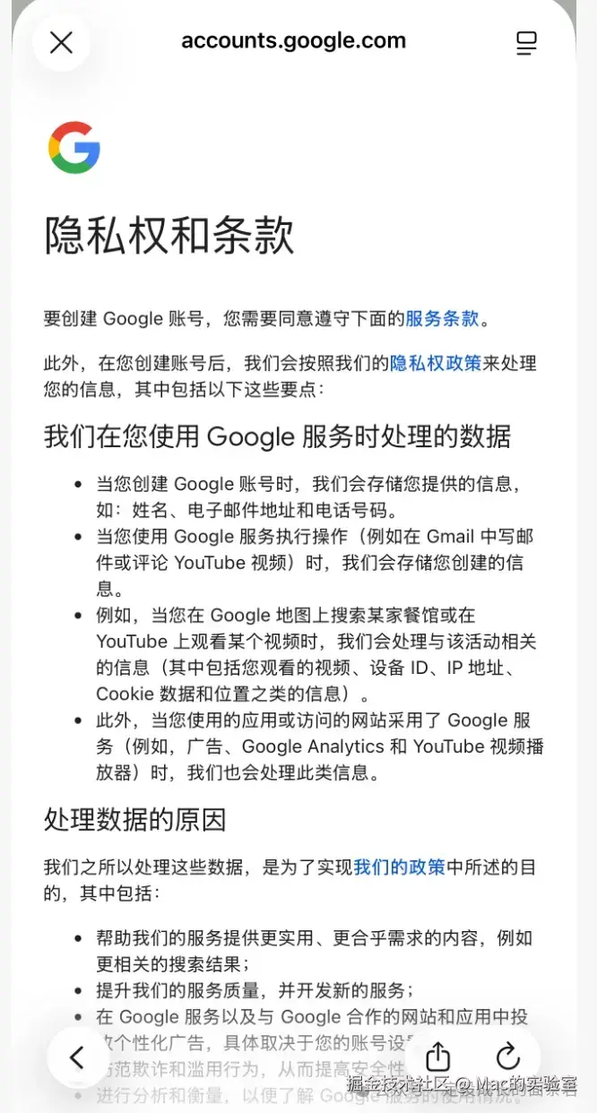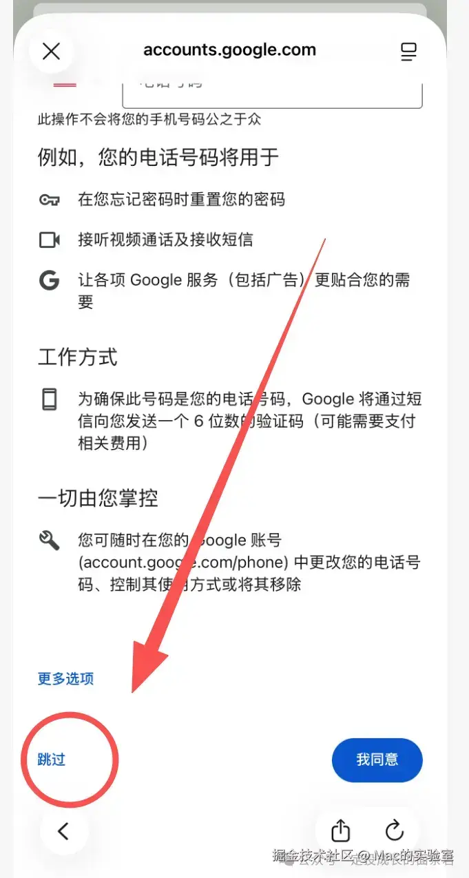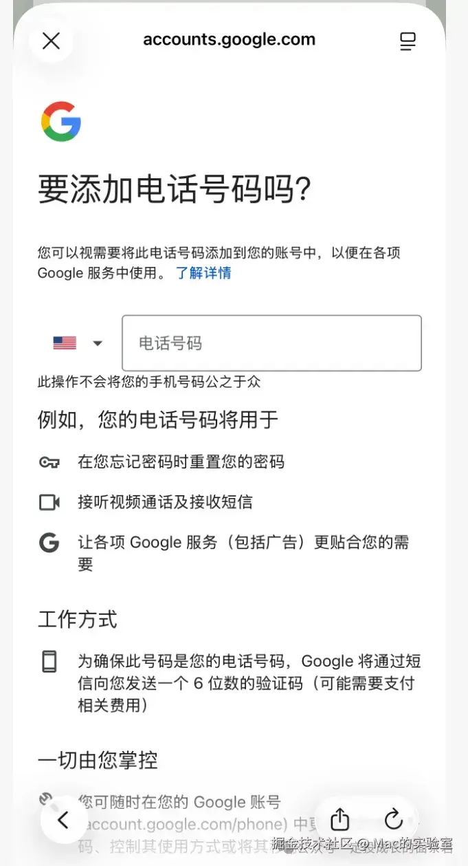 2.9 其他:如果你的手机号在绑定的时候出现无法收到验证码的情况,建议你咨询一下相关的运营商,他们会帮你解决的。如果解决不了可以参见公众号:Mac的实验室 后台回复 谷歌 获取最新谷歌注册教程,长期更新Google注册最新有效方法。