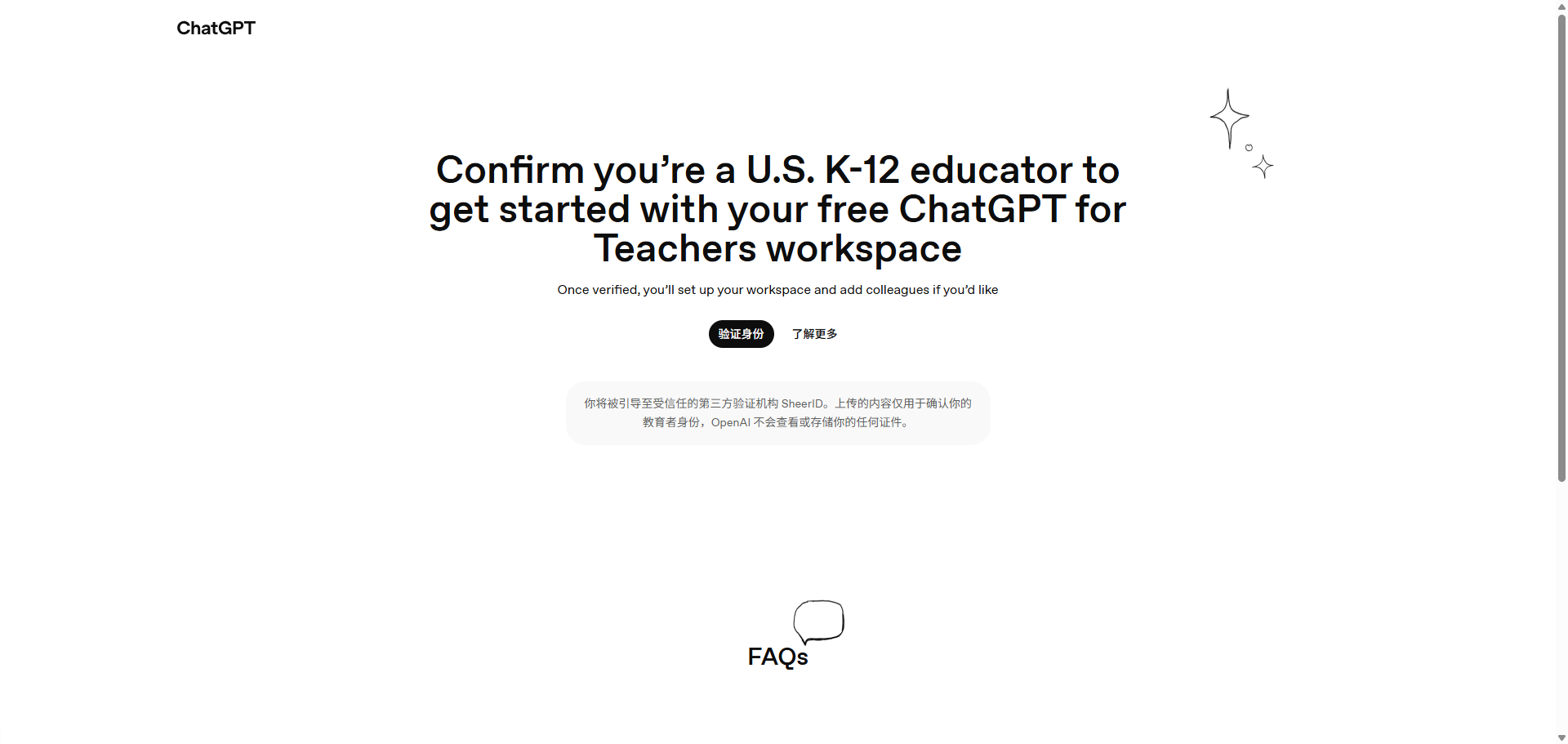 访问 ChatGPT 的教育版 注册页面(或 Gemini/Spotify 对应的学生优惠页面),点击验证身份,进入 SheerID 的填写界面。