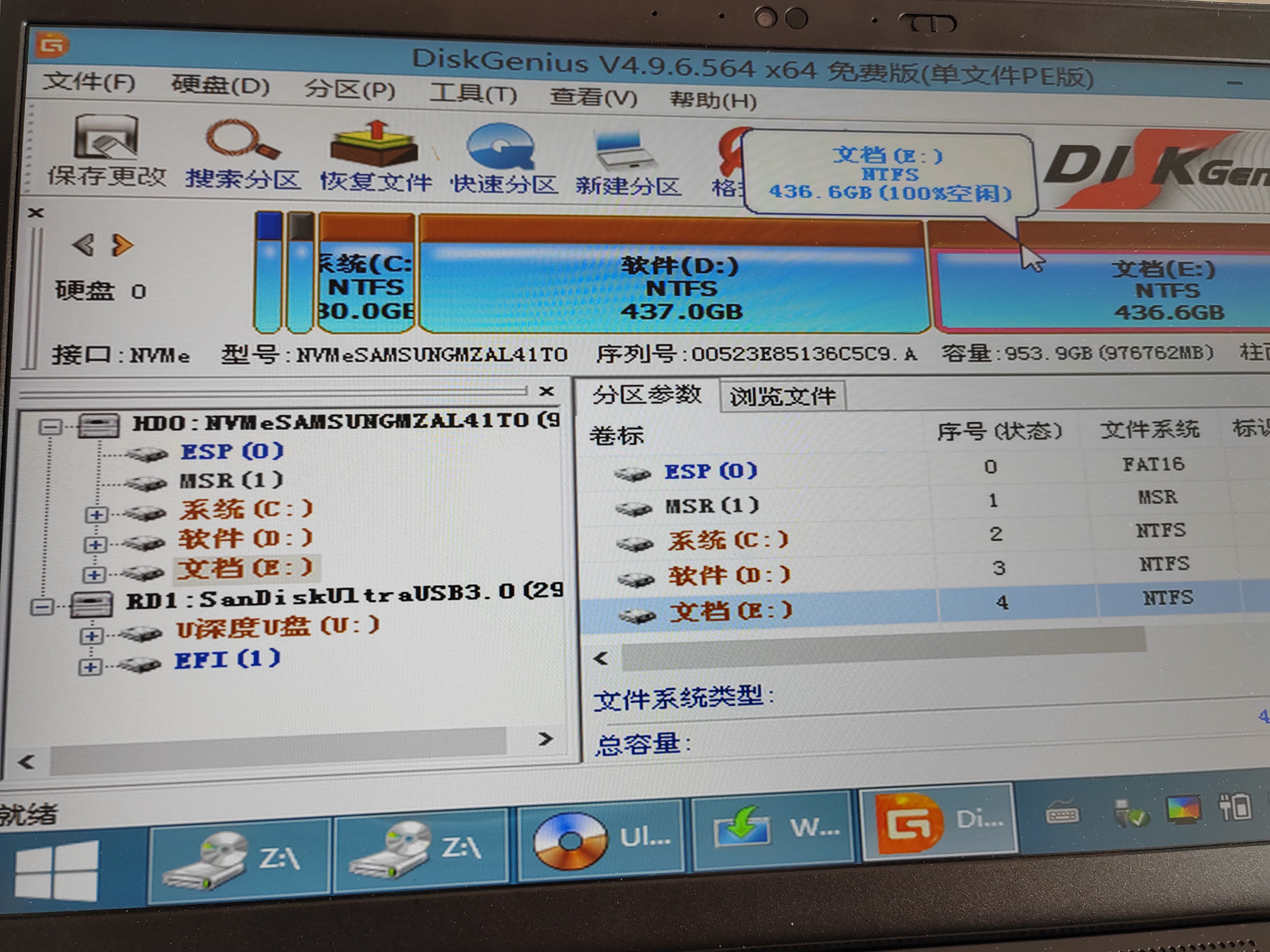3、再使用U盘pe系统,硬盘分区工具,快速分区工具,一键划分为三个区,同时默认创建msr 。