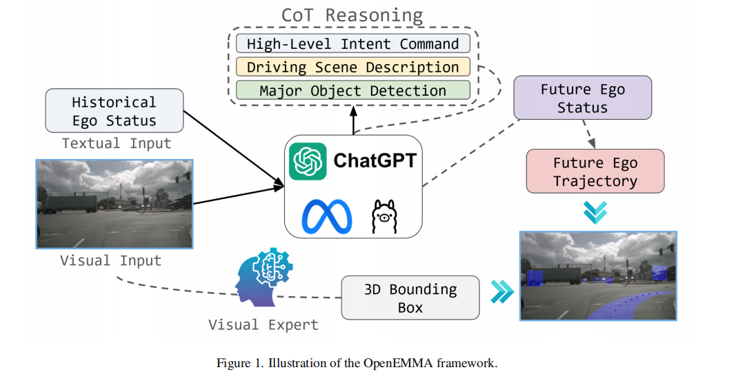 OpenEMMA 是一款计算高效的端到端自动驾驶系统,核心输入为前视摄像头图像(视觉输入)和车辆历史状态数据(文本输入),核心输出为未来行驶轨迹和道路目标 3D 检测结果。框架整体分为两大核心模块:基于思维链的端到端规划模块、视觉专家增强的目标检测模块,同时通过统一的流程设计实现两大模块的协同工作。其整体架构如图 1 所示: