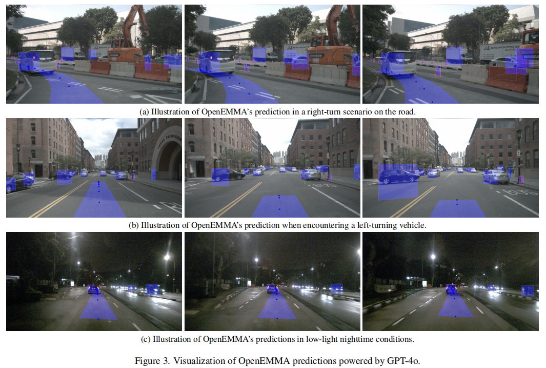 论文选取 3 个典型复杂场景,展示 OpenEMMA(以 GPT-4o 为 backbone)的轨迹规划能力,结果如图 3 所示: