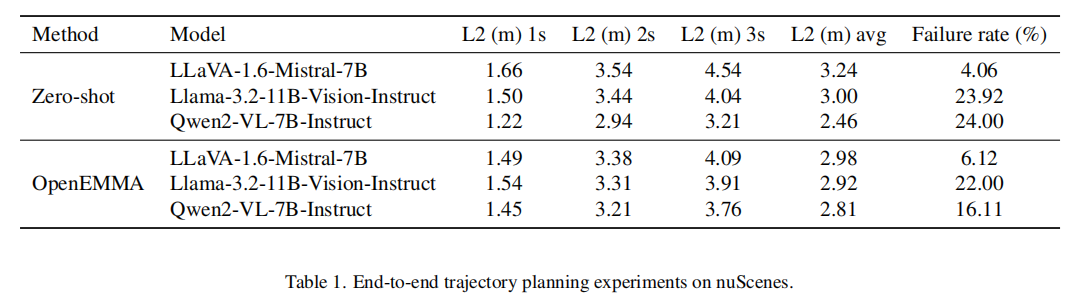 - Qwen2-VL-7B-Instruct 的特殊表现:OpenEMMA 版本的 L2 误差(2.92 米)高于零样本基准(2.46 米),但失败率从 24.00% 降至 22.00%。原因是 OpenEMMA 成功为零样本基准无法处理的复杂场景生成了预测结果,虽部分场景轨迹精度不足,但整体鲁棒性提升。