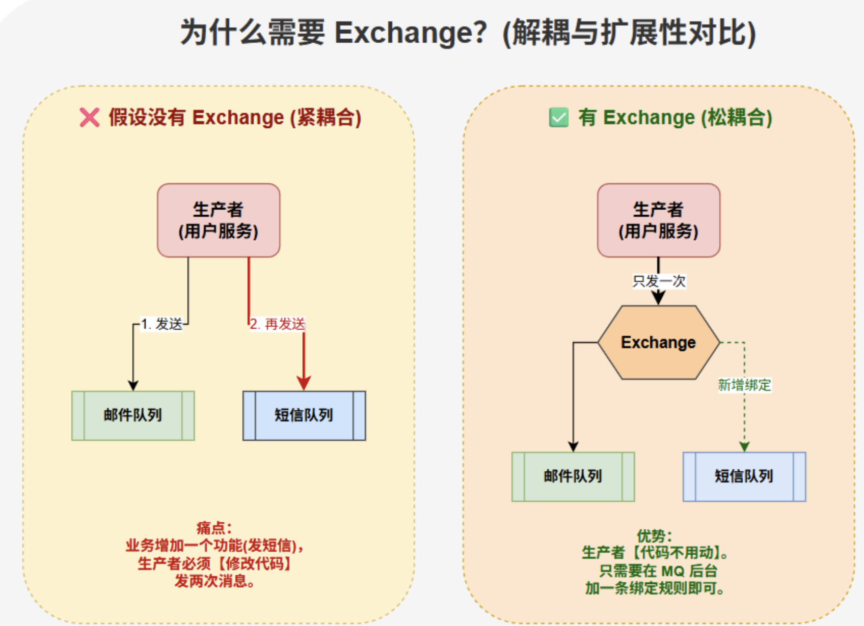 如果你的业务变了,比如注册成功的消息,原本只需要发邮件(QueueA),现在需要加一个发短信(QueueB)