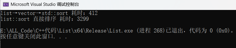 从运行结果能明显看到:"list→vector→std::sort" 仅耗时 412,而 "list::sort 直接排序" 耗时 3299,前者效率是后者的 8 倍左右,充分体现了借助 vector+std::sort 优化 list 排序的显著优势。