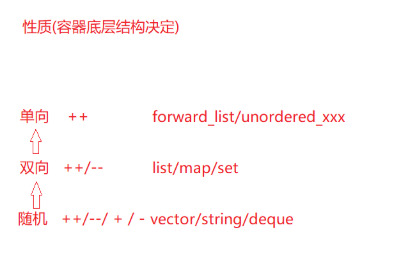 双向迭代器 :支持++/--(前后移动),对应底层是双向链表 / 树形结构的容器(如list、map、set);