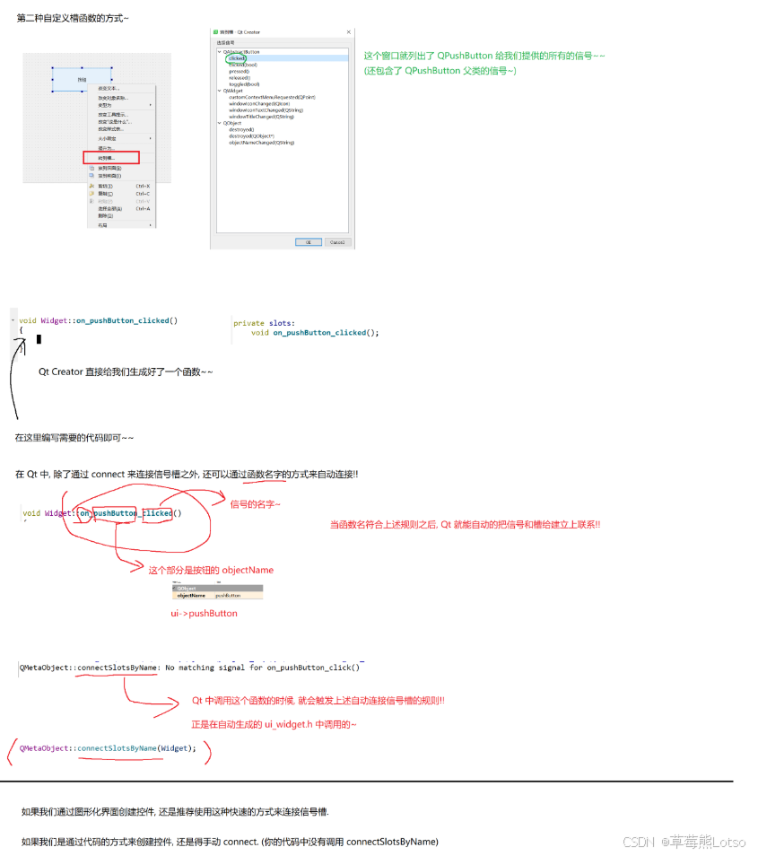 on_对象名_信号名(如on_pushButton_clicked),Qt 会自动关联,无需手动connect。