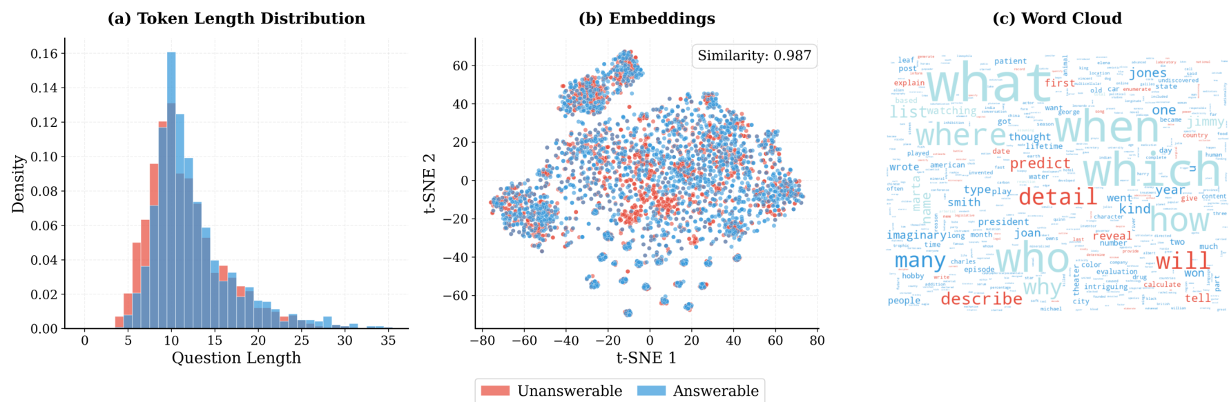 图 3 (a) 长度分布显示可回答和不可回答问题之间具有相似的令牌计数。(b) 问题嵌入的 t-SNE 可视化揭示了实质性的语义重叠,表明可回答和不可回答问题在语义上是无法区分的。类别特定的相似性细分显示在附录图 9 中。© OVERSEARCHQA 中可回答和不可回答问题的词云。