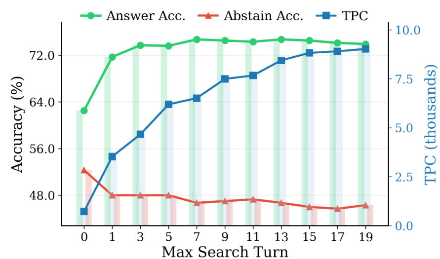 图 2 o4-mini 在最大搜索轮次从 0 增加到 19 时的性能。答案准确性(针对可回答查询)从无搜索到一次搜索显著提高,随后在约 7 次搜索后达到峰值并趋于平稳。拒绝回答准确性(针对不可回答查询)随着搜索次数的增加而持续下降。与此同时,TPC 单调上升,这表明存在过度搜索:成本累积速度快于正确性收益,因为额外的搜索既没有提高答案准确性,也没有阻止拒绝回答准确性的下降。
