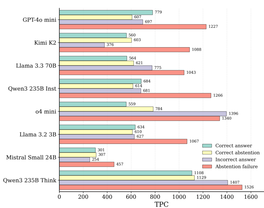 | Model | Ans. | Abst. | TPC | Ans. | Abst. | TPC | Ans. | Abst. | TPC | Ans. | Abst. | TPC | Ans. | Abst. | TPC |