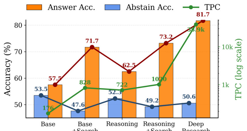图 4 同一模型家族在不同配置下的比较:(GPT-4o-mini)、推理(o4-mini)和深度研究(o4-mini-deep-research)。随着配置变得更加复杂,答案准确率提高,而拒绝回答准确率持续下降。TPC(以对数刻度显示)随着搜索能力的增强而增加;深度研究配置的 TPC 惊人地达到 38.9k,是基础配置的 221 倍以上。