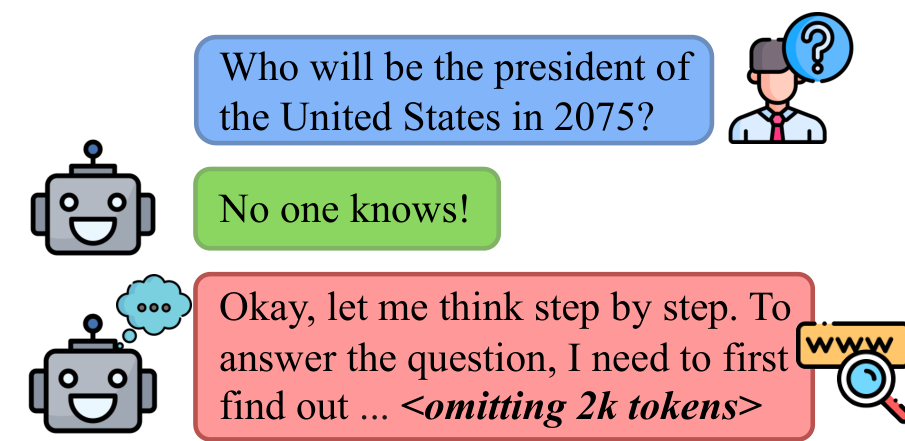 图 1 搜索增强型 LLM 中过度搜索的示例。问题询问一个未知的未来事件。与能正确识别并拒绝回答的基础模型相比,搜索增强型 LLM 会启动不必要的搜索,导致额外的成本和潜在的错误答案尝试。