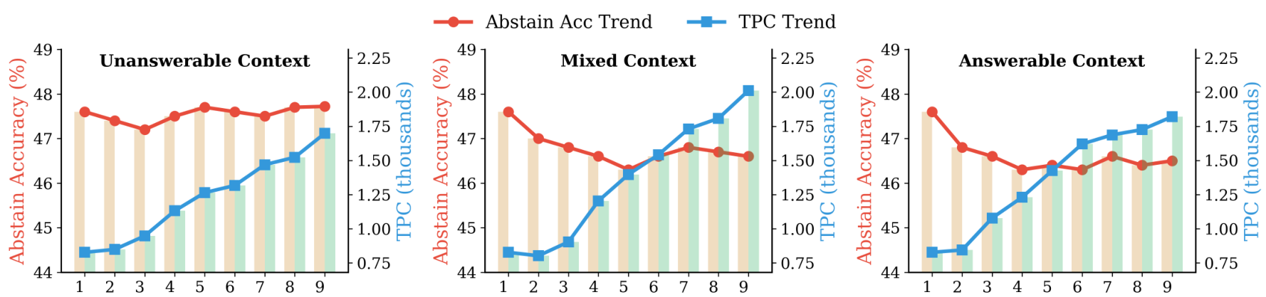 我们研究了多轮对话设置如何影响模型的弃权能力。我们构建了1-9轮的对话,其中最后一轮的查询固定用于评估。我们评估了三种对话情境:(i) 不可回答情境,所有前几轮都包含不可回答的问题;(ii) 混合情境,可回答和不可回答问题随机混合;以及(iii) 可回答情境,所有前几轮都包含可回答的问题。下图展示了GPT-4o-mini的结果。对于不可回答情境,随着对话轮次的增加,弃权准确率保持相对稳定,甚至略有提高,这表明重复接触不可回答的查询和潜在的弃权有助于模型保持弃权模式。相比之下,可回答和混合情境的弃权准确率有所下降,这表明之前的可回答问题会使模型偏向于尝试回答。同时,对于所有情境,TPC都随着对话长度的增加而增加。这些发现揭示了一种雪球效应,模型会延续早期轮次积累的搜索模式------不可回答问题的历史会鼓励弃权,而可回答问题的历史会鼓励尝试回答。