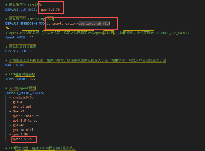 例如你使用ollama的qwen2.5:7b模型和bge-large-zh-v1.5设置如下:DEFAULT_LLM_MODEL 设置成qwen2.5:7b ,DEFAULT_EMBEDDING_MODEL 设置成smartcreation/bge-large-zh-v1.5 ,SUPPORT_AGENT_MODELS 也加上qwen2.5:7b ,这里注意smartcreation/,一定要加上,不然会报错。