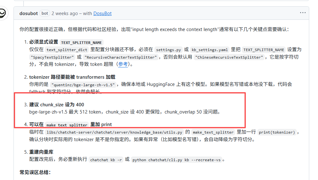 ERROR | chatchat.init_database:worker:61 - Error raised by inference API HTTP code: 500, {"error":"the input length exceeds the context length"}