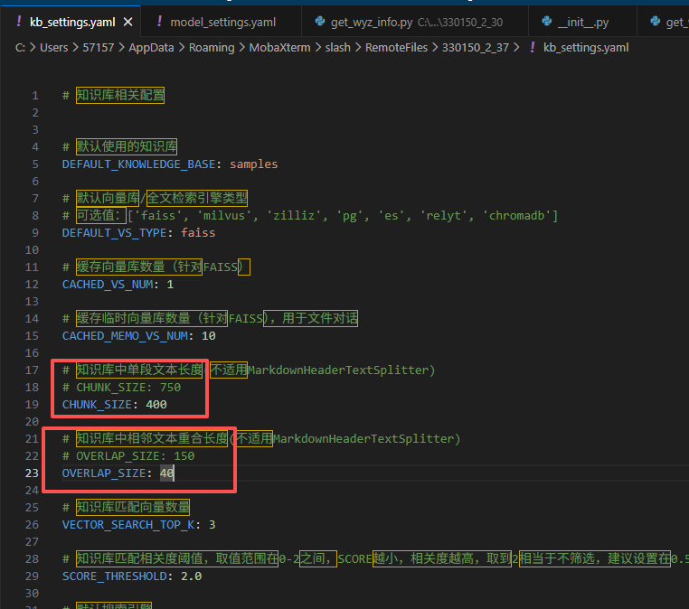 找到你初始化出来的文件kb_settings.yaml,然后将chunk_size 设 400 ,chunk_overlap 设置为50 ,如下图所示: