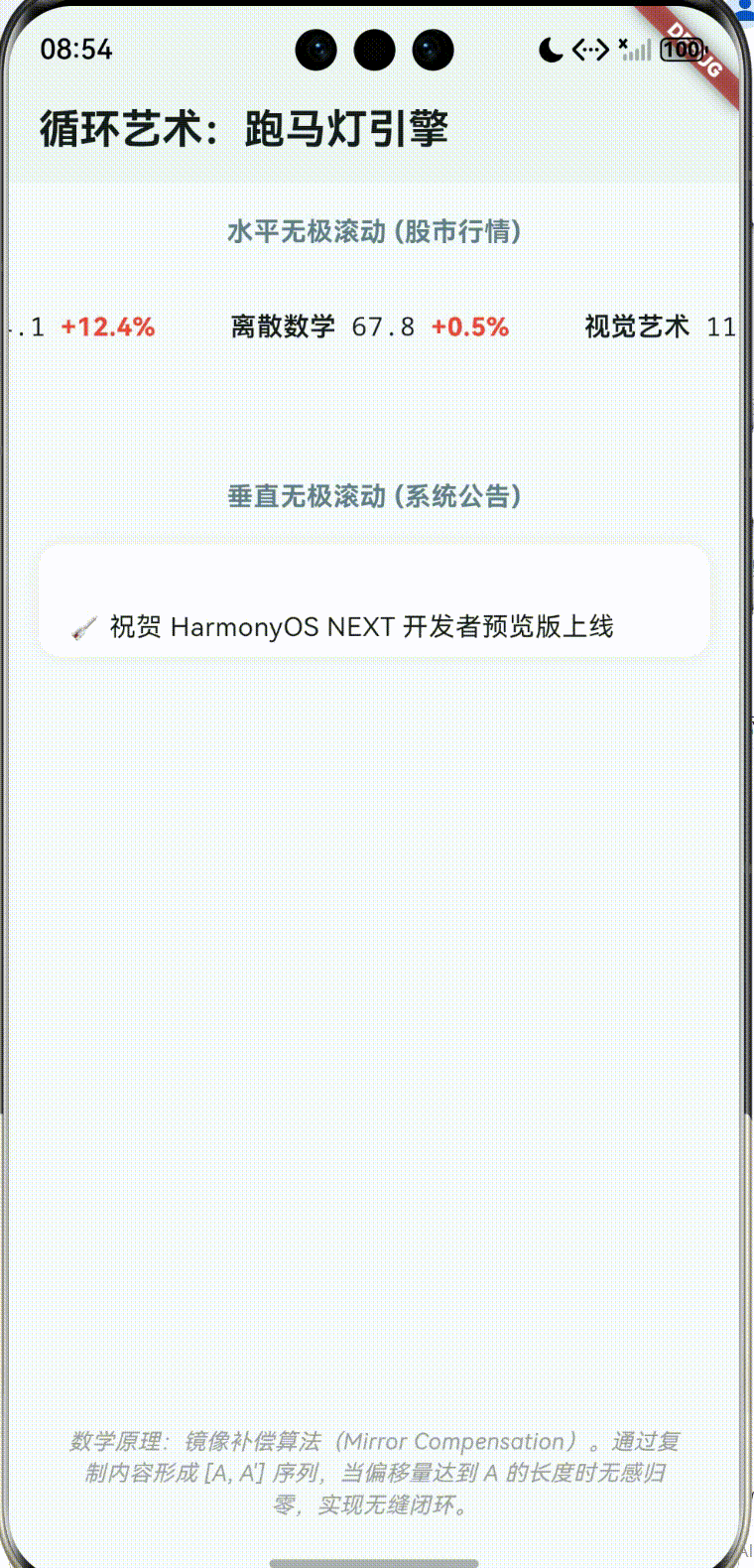在 lib/main.dart 中,我们实现了一个名为 "Harmony Ticker" 的综合跑马灯系统。