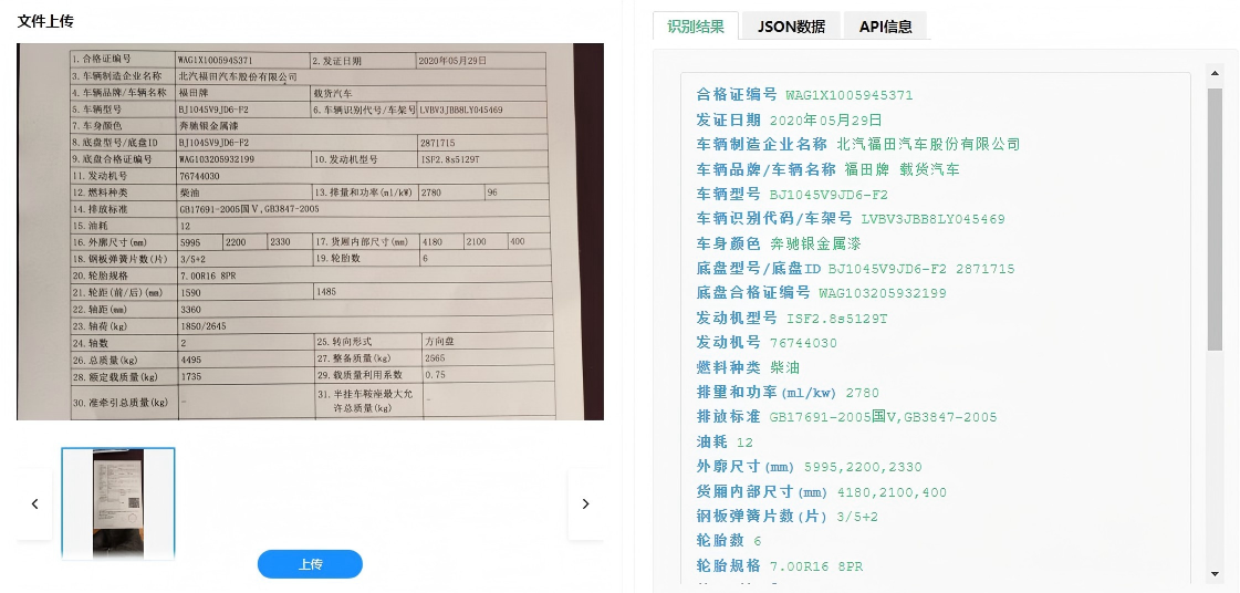 - 识别后的文本通过命名实体识别(NER)技术提取结构化字段,并依据国家《车辆合格证管理规范》内置业务规则进行逻辑一致性校验(如VIN码校验位验证、车型与排量匹配性检查等),确保输出数据的合规性与可用性。