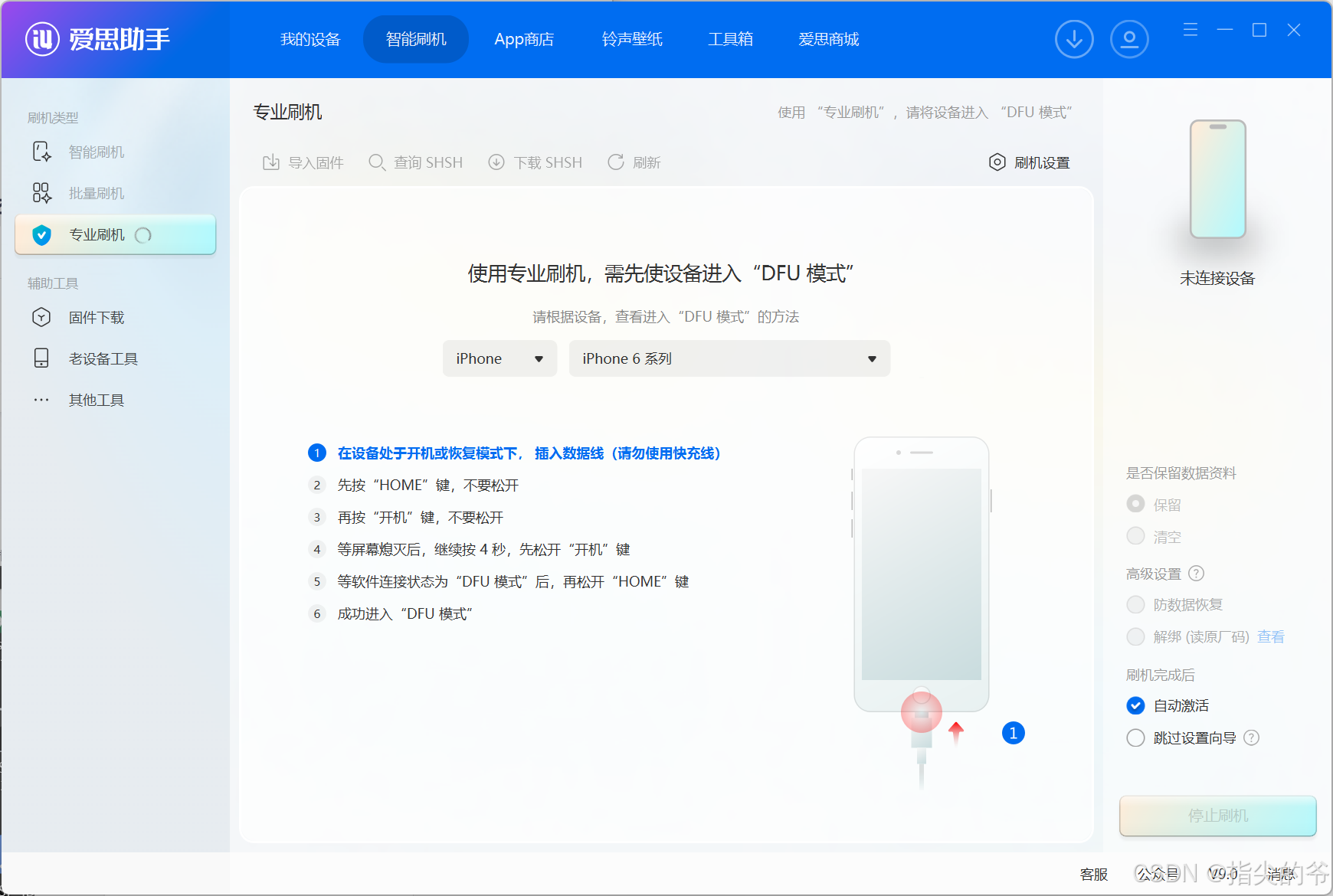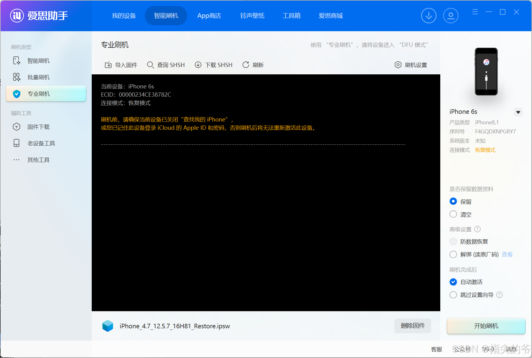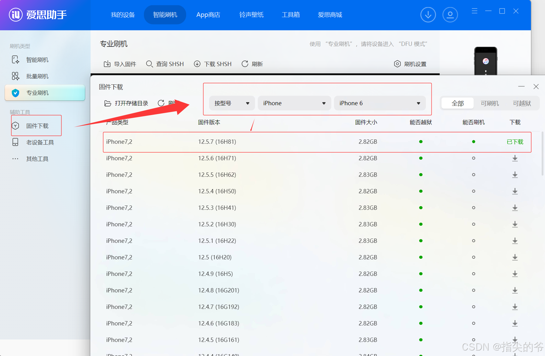 选择下载固件,输入手机版本,选择对应的系统(老手机,保守些选择),iphone6最高支持到ios12