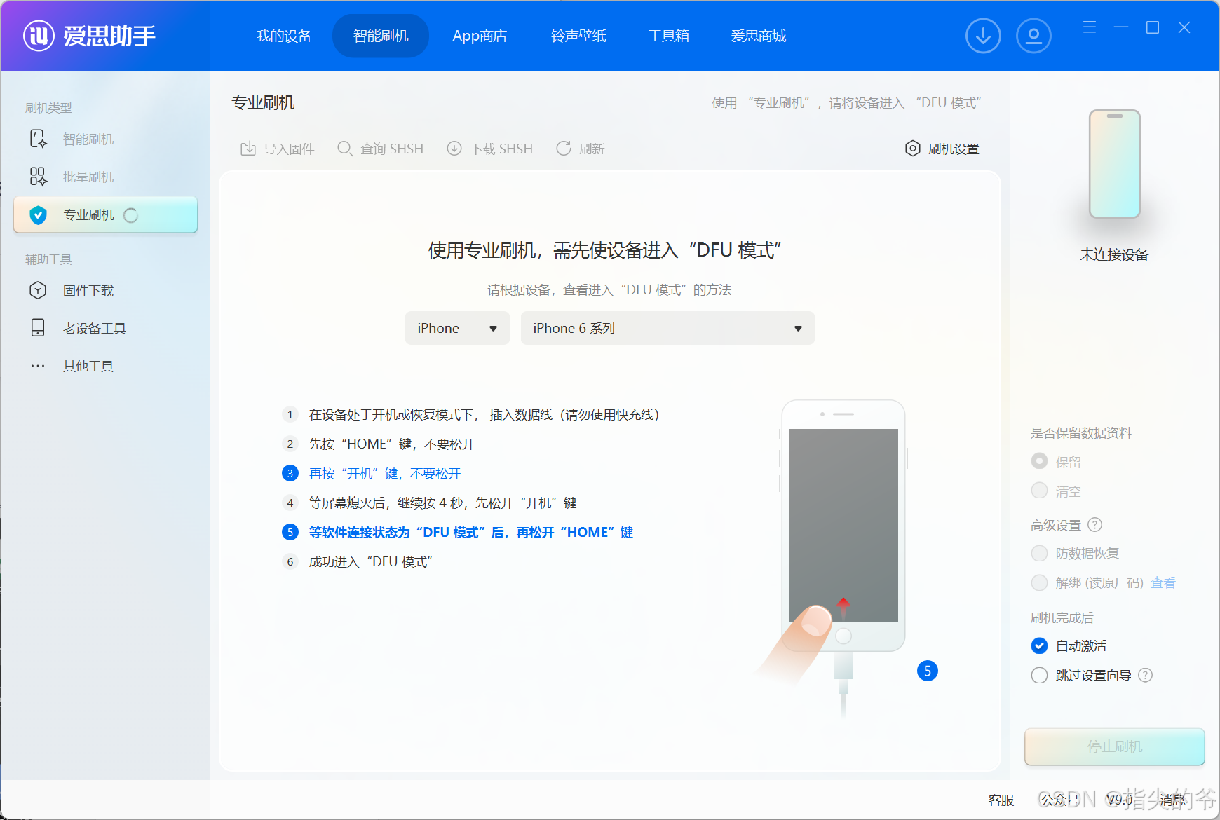 继续按住home按键,松开开机键,进入DFU模式后,松开Home键,这个时候就连上爱思了
