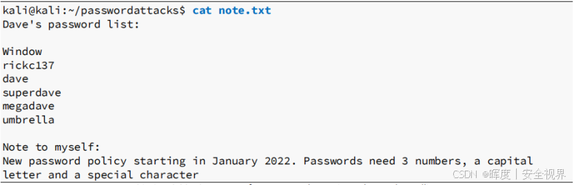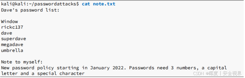 该文件竟以明文形式 记录了用户"Dave"的潜在密码列表!这为后续破解SSH私钥的密码短语提供了宝贵的字典来源。同时,还说了: