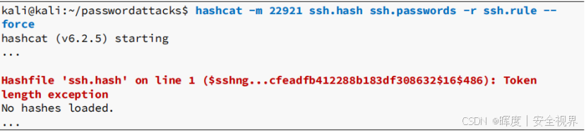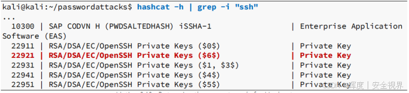 通过分析哈希前缀 $6$ ,确定对应的Hashcat模式为22921。这是标准的SSH私钥哈希格式识别步骤。