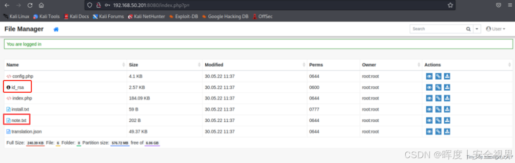 在登录文件管理器后,攻击者在服务主目录中发现了两个重要文件,将这两个文件下载至本地Kali机器的**passwordattacks 目录**中。