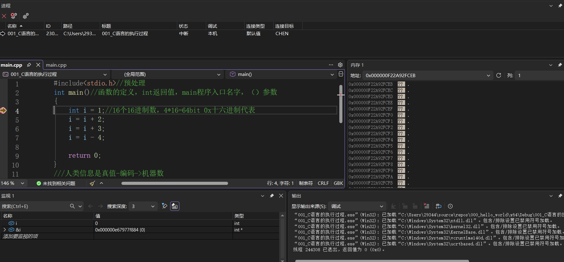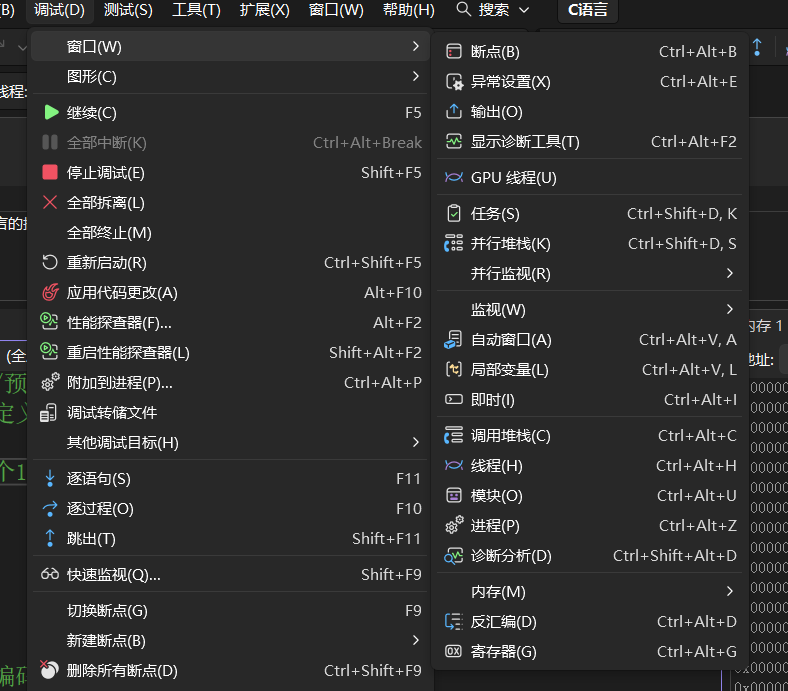 vs存在着普通状态和调试状态。如何进入调试状态?进入调试状态以后,调整好输出、监视、内存和调用堆栈窗口的布局