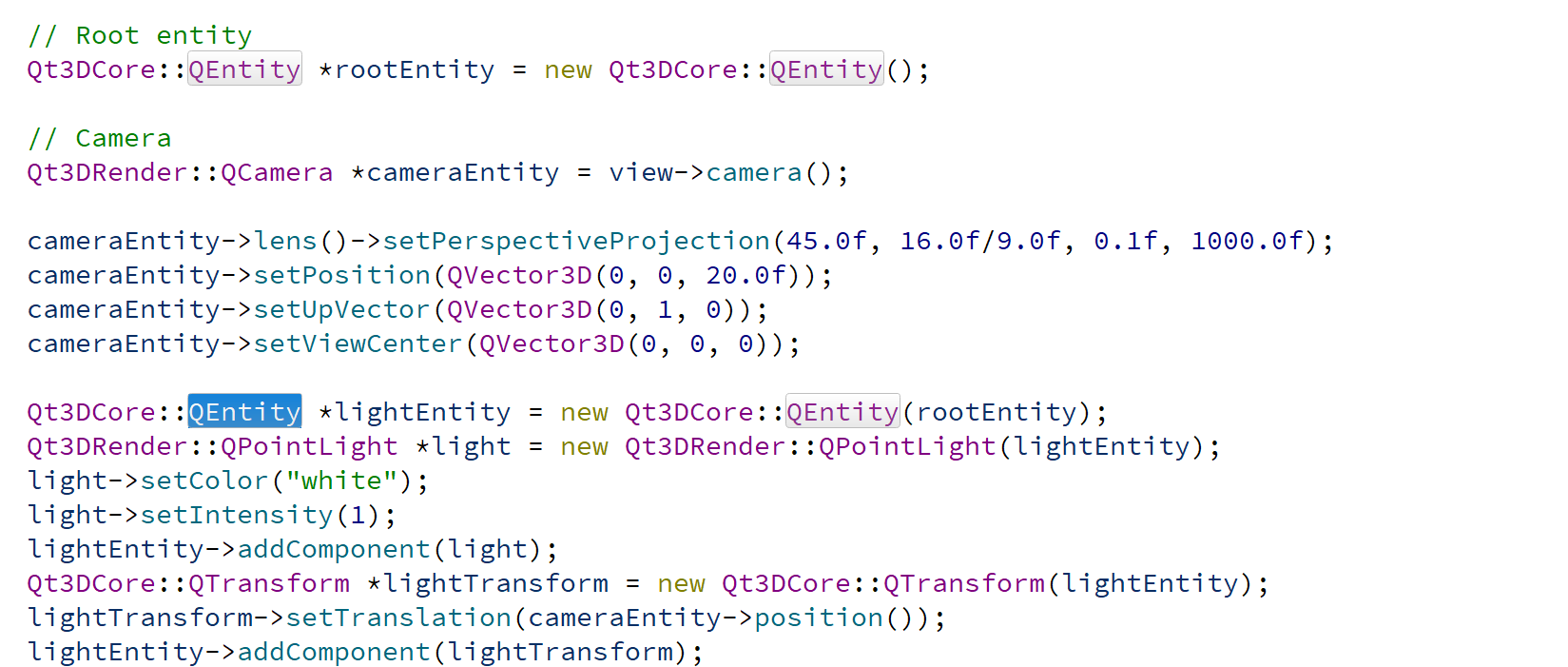 Qt3DCore::QEntity *entity = new Qt3DCore::QEntity();