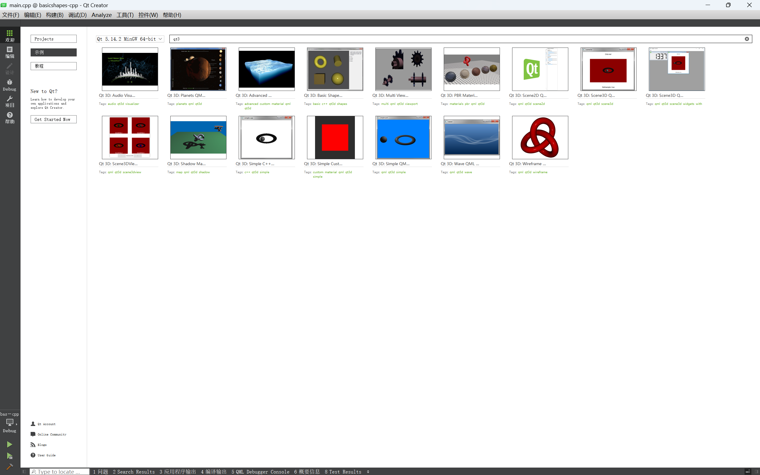 我们现在Qt的欢迎搜索qt3D,选择第一排的第四个演示示例,我们会根据这个示例来学习Qt3D相关的知识。
