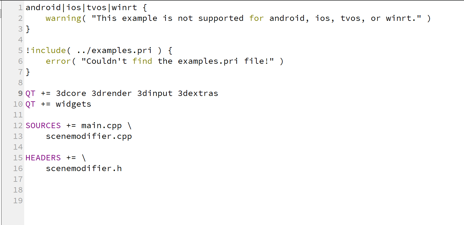 我们看到第九行内容为 QT += 3dcore 3drender 3dinput 3dextras这是Qt3D项目中4哥关键的模块。