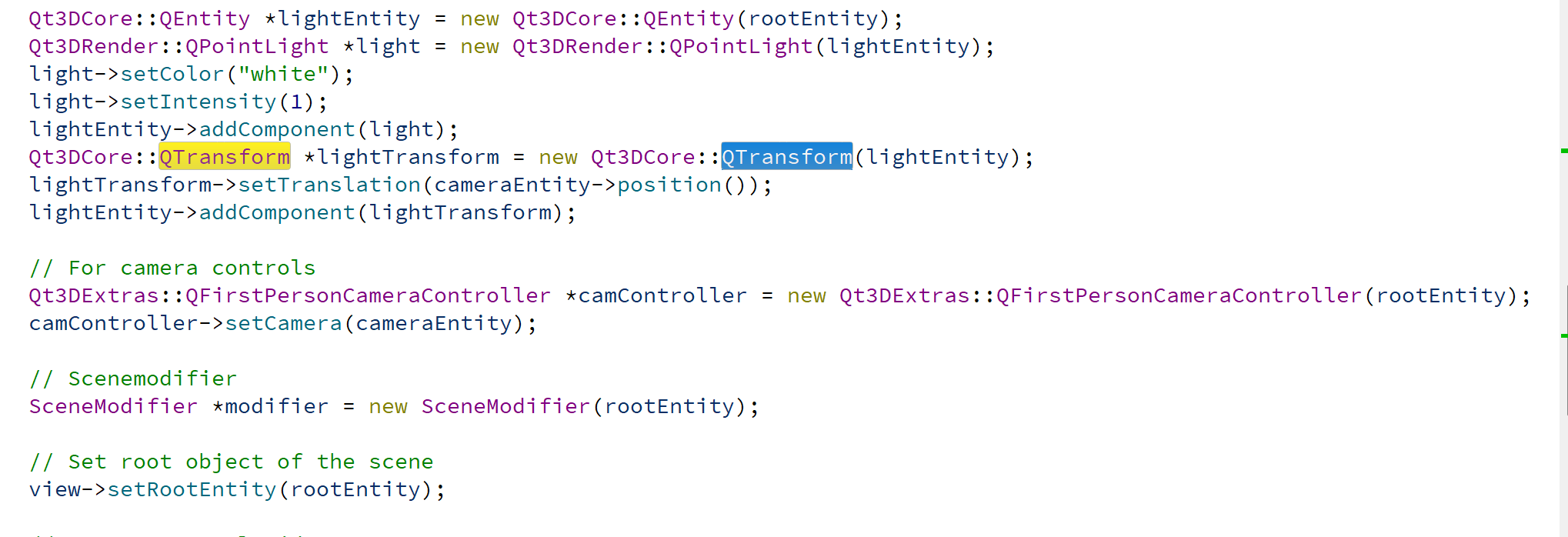 Qt3DCore::QTransform *transform = new Qt3DCore::QTransform();