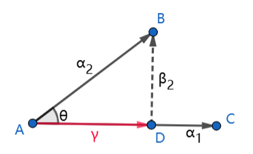 以 β 2 \beta_2 β2 为例,从向量 α 2 \alpha_2 α2 向向量 α 1 \alpha_1 α1 作垂线,得向量 r r r ,则向量 r r r 的长度为 ∣ ∣ α 2 ∣ ∣ cos θ ||\alpha_2||\cos{\theta} ∣∣α2∣∣cosθ,方向为 α 1 ∣ ∣ α 1 ∣ ∣ \frac{\alpha_1}{||\alpha_1||} ∣∣α1∣∣α1,故向量