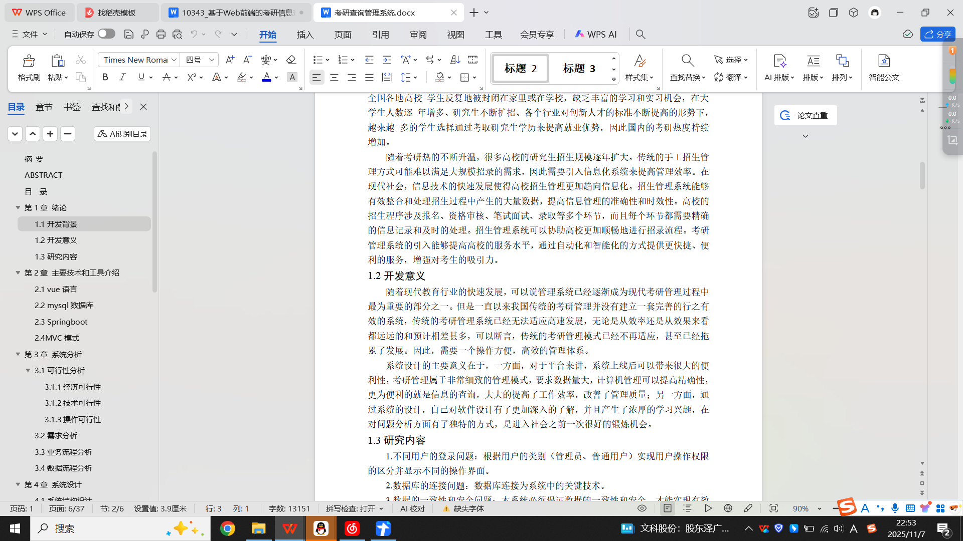 本考研查询管理系统是针对目前国内考研现状的实际需求,从实际工作出发,对过去及当前考研相关方面存在的问题进行分析,结合计算机系统的结构、概念、模型、原理、方法,在计算机各种优势的情况下,采用目前最流行的B/S结构和Java中流行的Springboot框架和eclipse编辑器、MYSQL数据库设计并实现的 。它帮助考研学生与高校实现了信息化、网络化,通过测试,实现了系统设计目标,相比传统的管理模式,本系统合理的利用了计算机相关技术及资源,有效的减少了考研招录管理的经济投入,大大提高了招录管理的效率。
