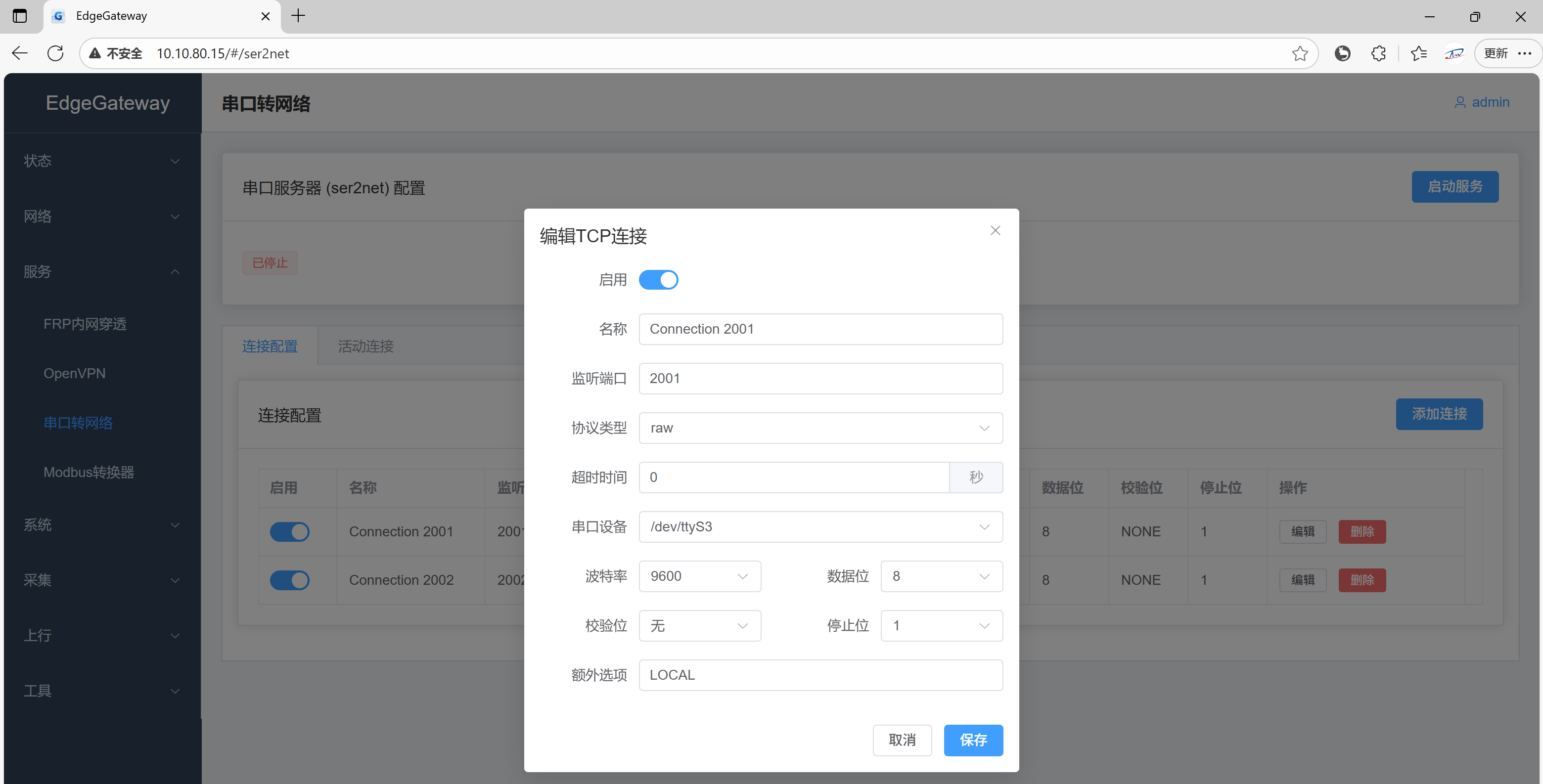 在 服务->串口转网络 中进行配置: