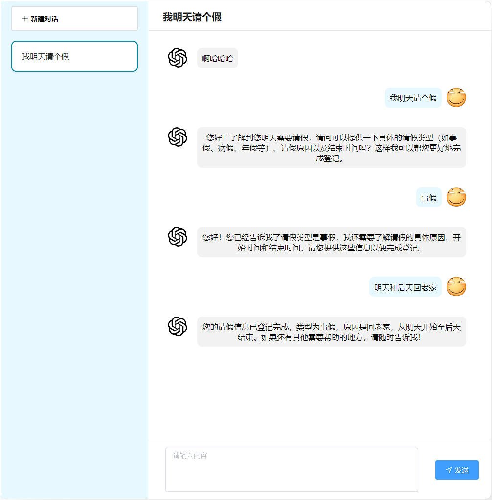 职责:通过多轮对话引导用户完善请假信息(时间 / 类型 / 原因),结构化解析后持久化存储,实现请假申请的自动化登记。