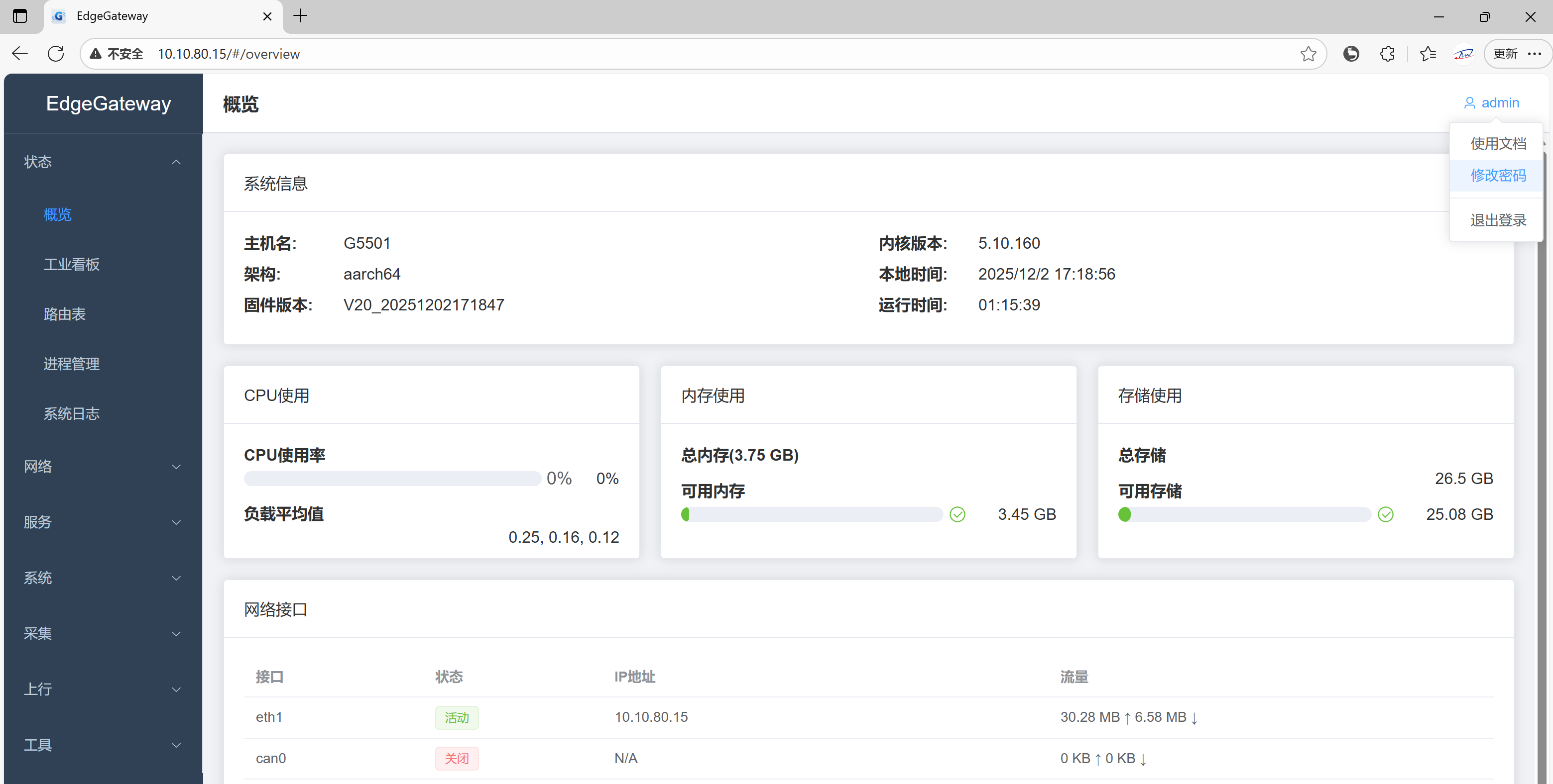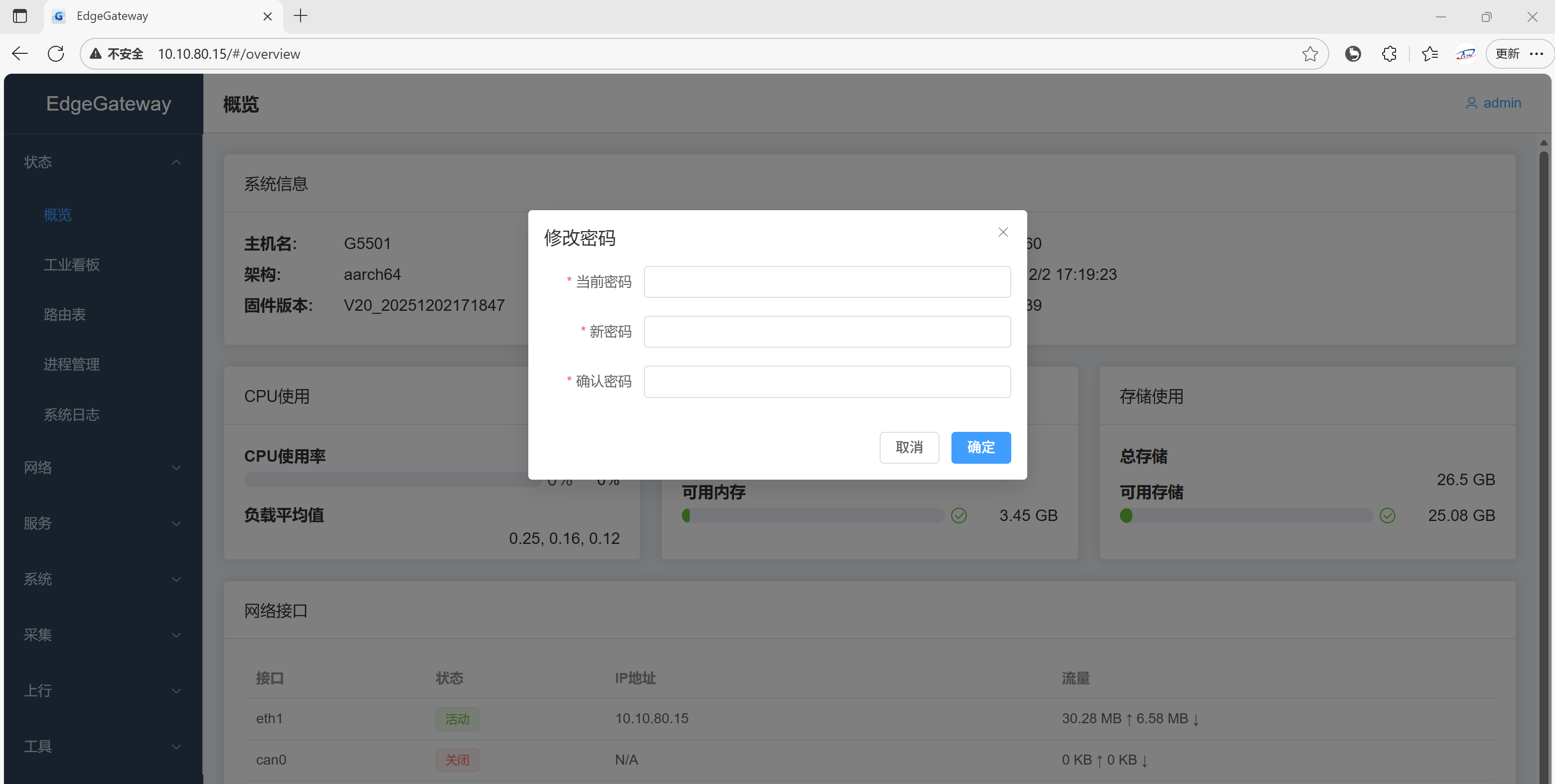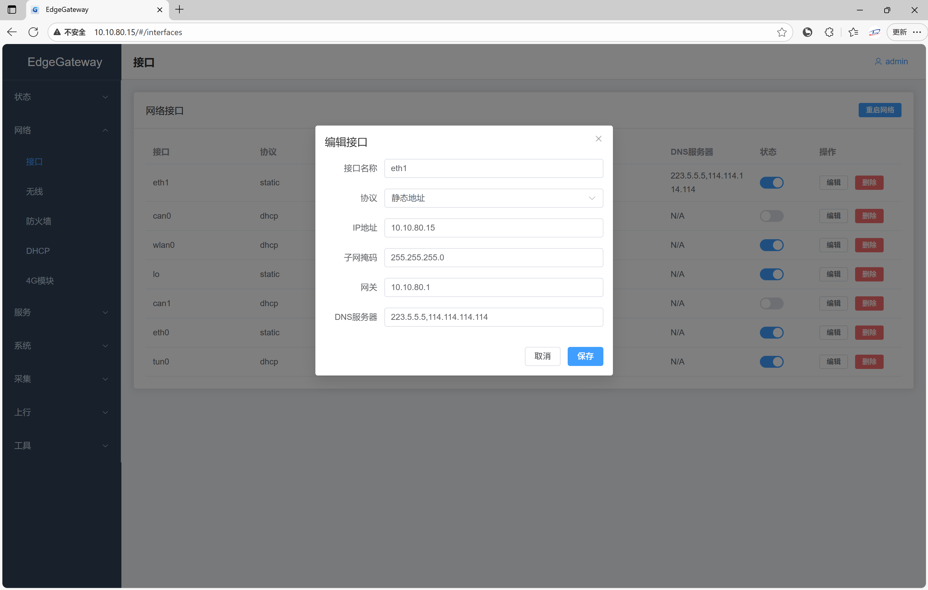 网络->接口->编辑,如将eth1的IP 修改为10.10.80.16,修改IP地址,协议 支持静态地址和动态地址。静态地址修改如下: