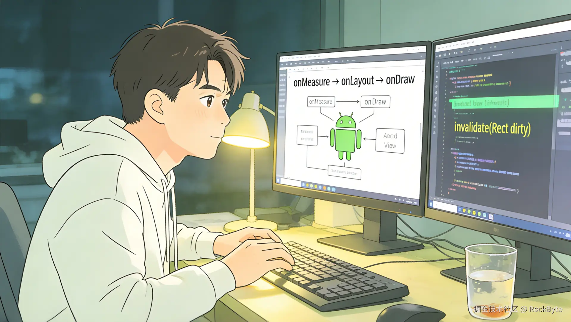 此刻,他闭眼片刻,脑海中再次回放笔记里的关键节点:从 onAttachedToWindow 完成 View 与窗口的绑定,到 onMeasure 测量尺寸、onLayout 确定位置,再到 onDraw 完成绘制,最后 onDetachedFromWindow 解绑销毁。