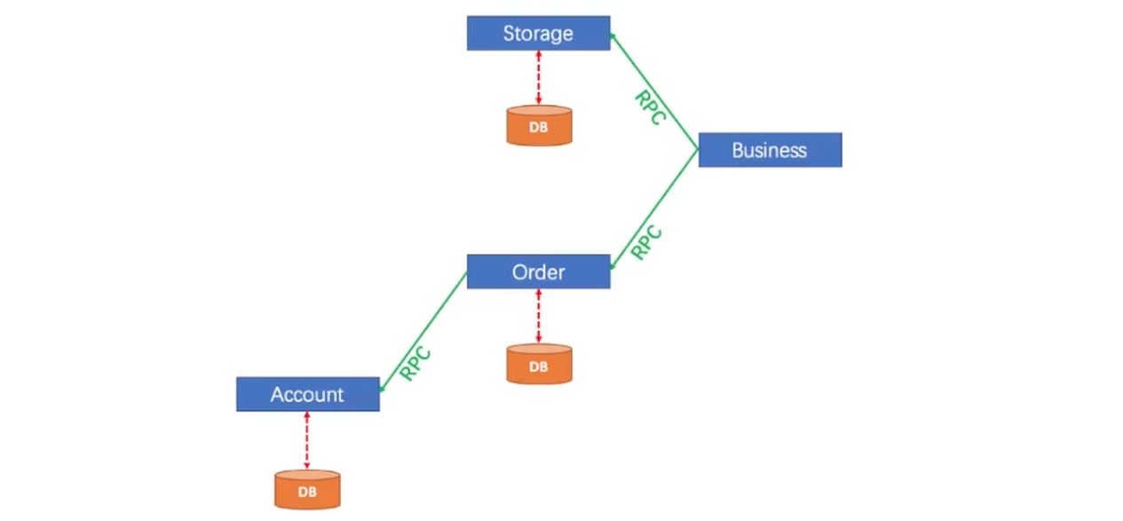 在微服务架构下,随着业务服务的拆分及数据库的拆分会存在如下图所示的场景,订单和库存分别拆分成了两个独立的数据库,当客户端发起一个下单操作时,需要在订单服务对应的数据库中创建订单,同时需要调用库存服务完成商品库存的扣减。